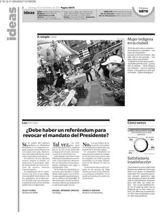 El documento presenta una portada de un periódico que incluye varias secciones como política, artes y análisis. Una de las secciones analiza si Bolivia debería realizar un referéndum para revocar el mandato del presidente Evo Morales y ofrece diferentes perspectivas sobre el tema. Otra sección explora si la iniciativa "economía verde" en Bolivia busca ser ecológica o generar ingresos económicos. Finalmente, la portada anuncia que Bolivia acogerá una reunión de la OEA el próximo