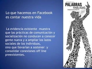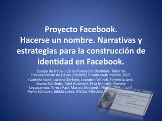 El documento analiza cómo los usuarios de Facebook construyen su identidad a través de narrativas y estrategias. Las personas comparten detalles de sus vidas para contar quiénes son a otros, pero esto no revela una identidad preexistente, sino que construyen dinámicamente quiénes son a través de las interacciones en la plataforma. La construcción de la identidad implica tensiones entre conceptos como interior/exterior, yo/otro y verdadero/falso, y depende de la mirada de los otros usuarios.