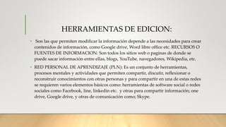 El documento describe los componentes de un Entorno Personal de Aprendizaje (PLE). Un PLE consta de tres partes: herramientas de edición para crear contenido, recursos y fuentes de información para obtener datos, y una red personal de aprendizaje para compartir conocimientos con otros. Algunas herramientas mencionadas son Google Drive, Word y Wikipedia, mientras que las redes sociales como Facebook y LinkedIn facilitan la construcción de una red personal para el intercambio de ideas.