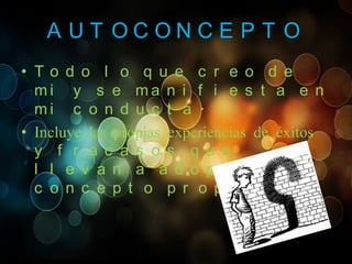 El documento presenta conceptos relacionados con la identidad personal. Define autoconcepto, autocoocimiento, autoestima, autovaloración, autorrespeto y autoaceptación. Estos conceptos se refieren a cómo una persona se percibe a sí misma, incluyendo sus fortalezas, debilidades, necesidades, emociones y la evaluación positiva o negativa de sus propias características.