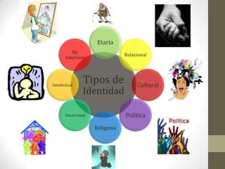 Este documento define la identidad personal como un conjunto de rasgos que caracterizan a una persona. Explora las principales influencias en la identidad como las modas y estereotipos. También discute diferentes tipos de identidades como la etaria, relacional, cultural, política, religiosa, vocacional e intelectual. Finalmente, señala que el contexto social y de grupo etario influyen mutuamente en la formación de la identidad y que es importante relacionarse con personas de diferentes pensamientos.