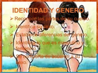 Este documento presenta una lista de objetivos para el desarrollo de niños en varias áreas como el reconocimiento del cuerpo, el género, la orientación espacial, las relaciones sociales, la autoestima, la responsabilidad, la música y la familia. Los objetivos incluyen que los niños reconozcan las partes de su cuerpo, su género, izquierda y derecha, y se comporten de acuerdo a su sexo.