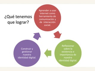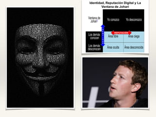 El documento discute la identidad digital y cómo las personas asumen múltiples roles e identidades en línea de la misma manera que en el mundo físico. Explica que la identidad digital está compuesta de varios elementos como la información personal expuesta en internet. Además, señala que aunque es más fácil cambiar la imagen que das en línea al no verse atributos físicos, la identidad en línea se construye a través de categorías sociales y atributos culturales que emergen durante la interacción.