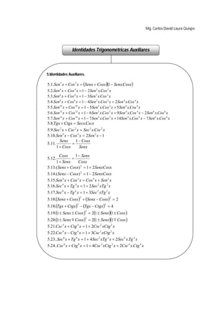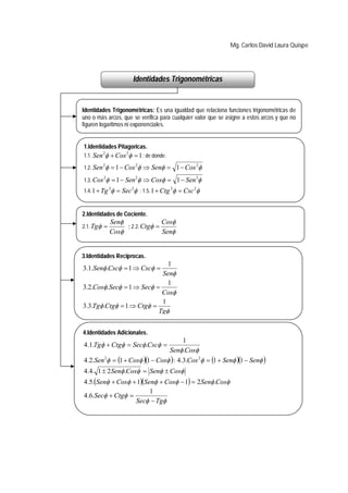 Este documento presenta diferentes identidades trigonométricas fundamentales y auxiliares, así como fórmulas para la suma y diferencia de ángulos. Incluye identidades pitagóricas, de cociente, reciprocas y adicionales. También cubre fórmulas para Sen(x ± y), Cos(x ± y), Tg(x ± y) y Ctg(x ± y), así como fórmulas auxiliares para la suma y diferencia de ángulos. Por último, ofrece consideraciones para resolver problemas con identidades trigonométricas.