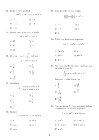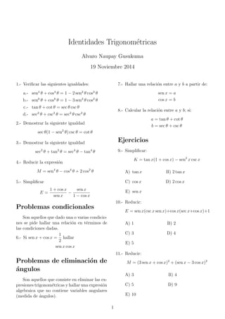 Este documento presenta 25 ejercicios de identidades trigonométricas y problemas relacionados. Los ejercicios incluyen verificar identidades trigonométricas, simplificar expresiones, resolver ecuaciones con funciones trigonométricas y reducir expresiones. El documento proporciona sugerencias para algunos ejercicios.