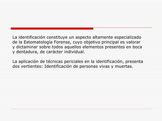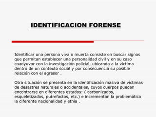 Este documento habla sobre la identificación forense de personas vivas y muertas. Explica que la identificación forense utiliza signos como la dentadura, huellas dactilares y características físicas para establecer la identidad civil de una persona y ayudar en investigaciones policiales. También se usa para identificar víctimas de desastres donde los cuerpos pueden estar carbonizados o descompuestos.