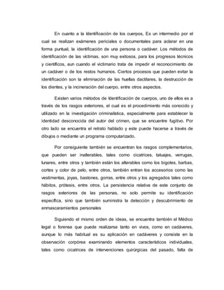 El documento describe varios métodos para la identificación de cuerpos y personas, incluyendo la identificación a través de rasgos externos, retratos hablados, rasgos complementarios, exámenes médico-legales, estudios dentales, estudios antropológicos, identificación biológica por ADN, identificación de pelos y sangre, comparación fotográfica, reconstrucciones bidimensionales, técnicas biométricas como la forma de la mano, rostro, voz, iris y retina, y la determinación de edad, sexo y ra