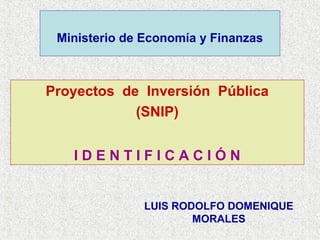 Este documento presenta información sobre el Sistema Nacional de Inversión Pública (SNIP) en Perú. Brevemente describe el marco legal del SNIP, las entidades participantes, y las fases del ciclo de un proyecto de inversión pública, que incluyen la identificación, formulación, evaluación, ejecución y post-inversión de los proyectos. Además, incluye esquemas y módulos para la elaboración del perfil de un proyecto, como aspectos generales, identificación, formulación y evaluación.