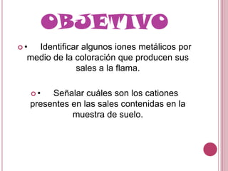 Este documento describe un experimento para identificar cationes metálicos mediante la coloración que producen al exponer sus sales a la llama. Se explica que los cationes son iones con carga positiva y se detallan los materiales y procedimientos para realizar la prueba con diferentes sales y observar la coloración resultante de cada catión.