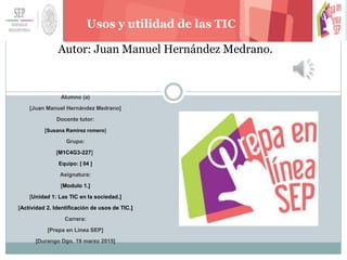 Este documento resume los usos y utilidad de las TIC en diferentes ámbitos como el trabajo, el comercio, el entretenimiento y la educación. En el trabajo se usan para la comunicación, presentaciones, facturación electrónica y videoconferencias. En el comercio permiten las ventas online, marketing y compras entre países. En el entretenimiento incluyen redes sociales, música online, videojuegos y aplicaciones móviles. Finalmente, en educación posibilitan los estudios en línea, presentaciones, investigación y acceso a la información para comun