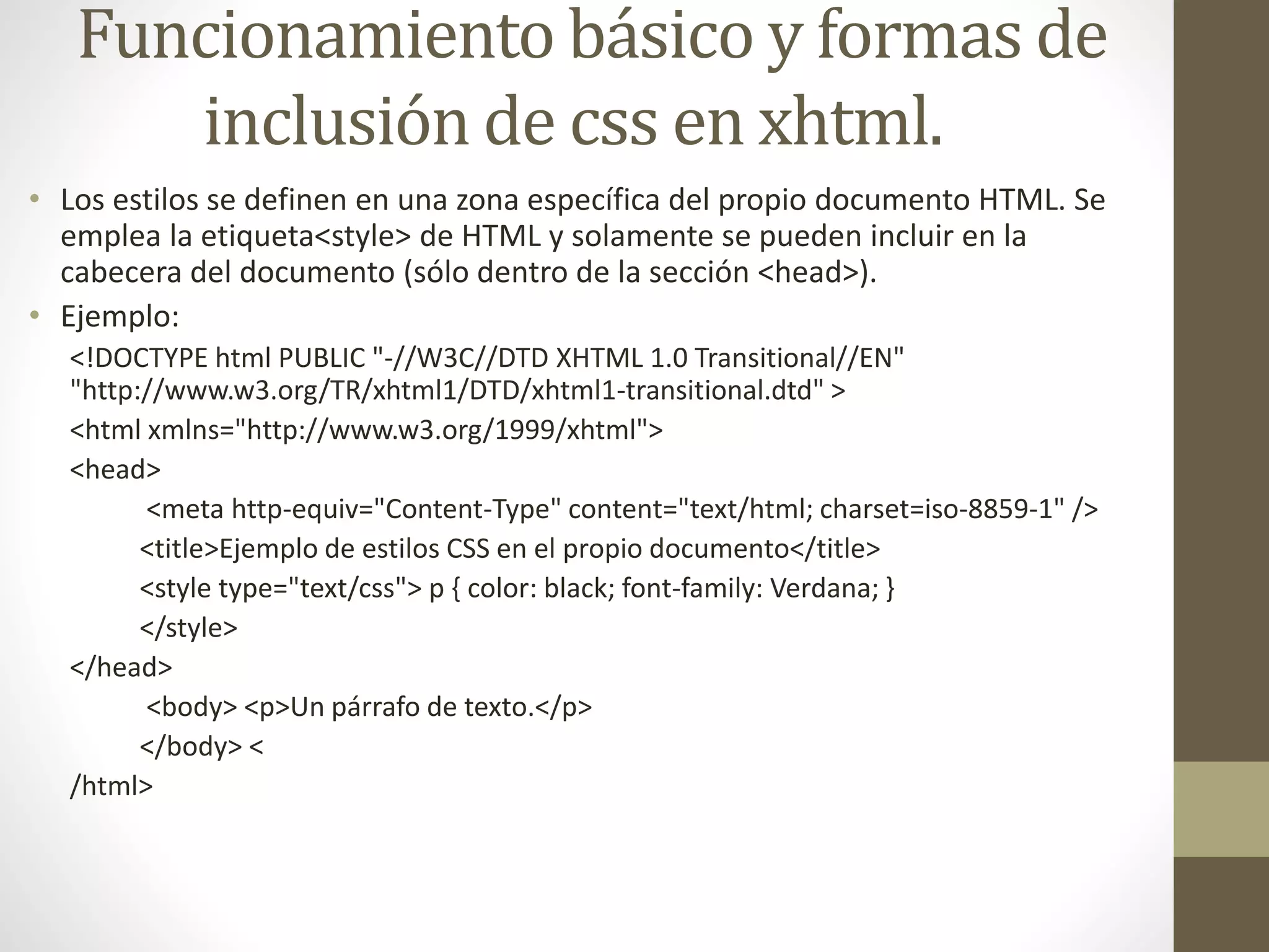 Este documento describe los conceptos básicos de CSS, incluyendo cómo incluir hojas de estilos en HTML, sintaxis básica, selectores, unidades de medida, colisiones de estilos y colores. Explica que CSS se puede incluir en la cabecera del documento HTML dentro de etiquetas <style> y <link>, y que la sintaxis básica consiste en selectores, propiedades y valores. También cubre temas como selectores anidados, agrupados y herencia, unidades absolutas y relativas, y diferentes formas de especificar colores.