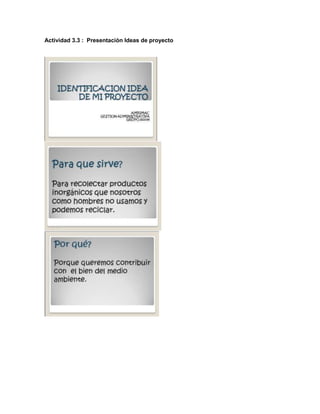 El documento presenta la idea de un proyecto para fabricar jeans usando residuos y papel reciclado para fabricar artículos como agendas, cuadernos y libretas. La región tendría demanda para estos productos debido al uso común de jeans y libretas. El proyecto busca materializar unidades productivas innovadoras y de calidad para proyectarse a nivel internacional, mientras contribuye con el medio ambiente.