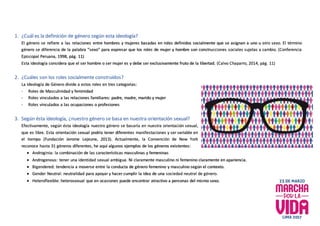 La ideología de género establece que la identidad sexual de una persona depende del entorno socio-cultural y no del sexo biológico con el que nace. Según esta ideología, el género se refiere a los roles definidos socialmente que se asignan a hombres y mujeres, y que son construcciones sociales sujetas a cambio, no determinadas biológicamente. El documento explica varios aspectos clave de esta ideología.