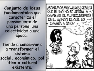 La ideología se refiere a un conjunto de ideas fundamentales que caracterizan el pensamiento de una persona, colectivo o época y que tienden a conservar o transformar el sistema social, económico, político o cultural existente. Según Destutt, la ideología es la expresión teórica de una estrategia de reconstrucción social, mientras que para Marx, la ideología prevaleciente es la herramienta de control social de la clase dominante. En derecho, la ideología se refiere a los discursos sobre los sistemas normativos legales,