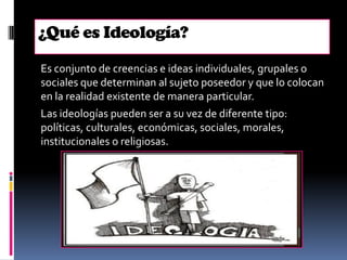 Este documento contiene información sobre varios temas relacionados con la ideología y la sociedad. Define ideología y menciona diferentes tipos como las ideologías políticas, culturales y religiosas. También describe la familia autoritaria y su función de reproducir la sociedad conservadora. Explica el concepto de función social y cómo las instituciones contribuyen a la sociedad como un todo. Por último, analiza el consumo como objeto-signo y cómo los objetos adquieren un valor simbólico en la sociedad de consumo.
