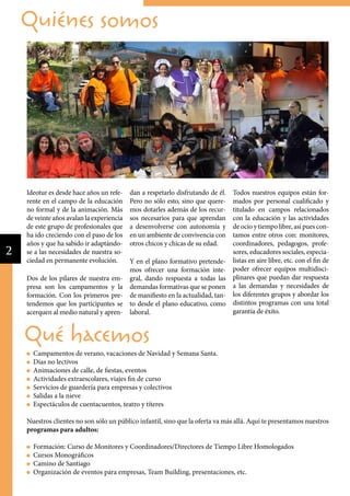 Este documento presenta la oferta de campamentos de verano de la empresa Ideotur. Ofrece campamentos en varias localizaciones de España con actividades como deportes, inglés, aventura y manualidades. Los campamentos están dirigidos a niños y jóvenes de entre 6 y 17 años y se realizan en julio y agosto. Ideotur cuenta con monitores cualificados y las instalaciones cumplen con todos los servicios necesarios.