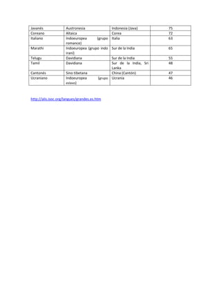 Este documento describe los principales idiomas del mundo. Define idioma como un sistema de comunicación propio de una comunidad humana. Luego presenta una tabla con los 20 idiomas más hablados, liderados por el chino con 885 millones de hablantes, seguido por el inglés con 450 millones y el hindi-urdu con 333 millones. La tabla incluye información sobre la familia lingüística, ubicación principal y cantidad estimada de hablantes de cada idioma.
