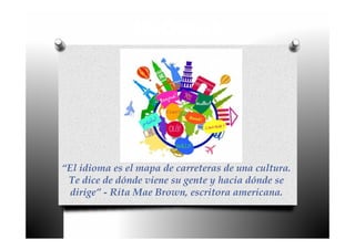 Este documento trata sobre los idiomas. Explica que los idiomas son sistemas de comunicación propios de las culturas humanas, y que se estima que existen entre 6,000 y 6,500 idiomas en el mundo. Además, discute brevemente las teorías del origen del lenguaje y las principales teorías científicas sobre el origen de los idiomas actuales. Finalmente, presenta una clasificación geográfica de los idiomas del mundo.