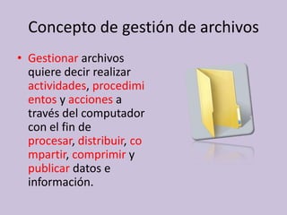 La gestión de archivos implica realizar actividades como procesar, distribuir, compartir, comprimir y publicar datos e información a través del computador. Algunos programas comunes para la gestión de archivos incluyen Winzip y WinRar para comprimir, pdf24.org para convertir, y slideshare.com y Dropbox para publicar y distribuir. Para publicar un archivo, se debe primero crear el documento, guardarlo, subirlo a slideshare.com y luego visualizarlo desde otro computador conectado a Internet.