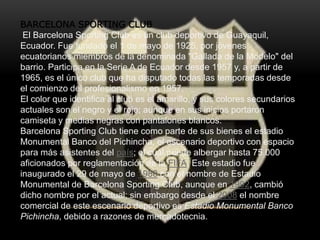 El Barcelona Sporting Club es un club deportivo fundado en 1925 en Guayaquil, Ecuador. Participa en la Serie A desde 1957 y ha disputado todas las temporadas desde el profesionalismo en 1957. Juega en el Estadio Monumental Banco Pichincha con capacidad para 75.000 espectadores. El club también tiene un museo que exhibe trofeos y camisetas históricas.