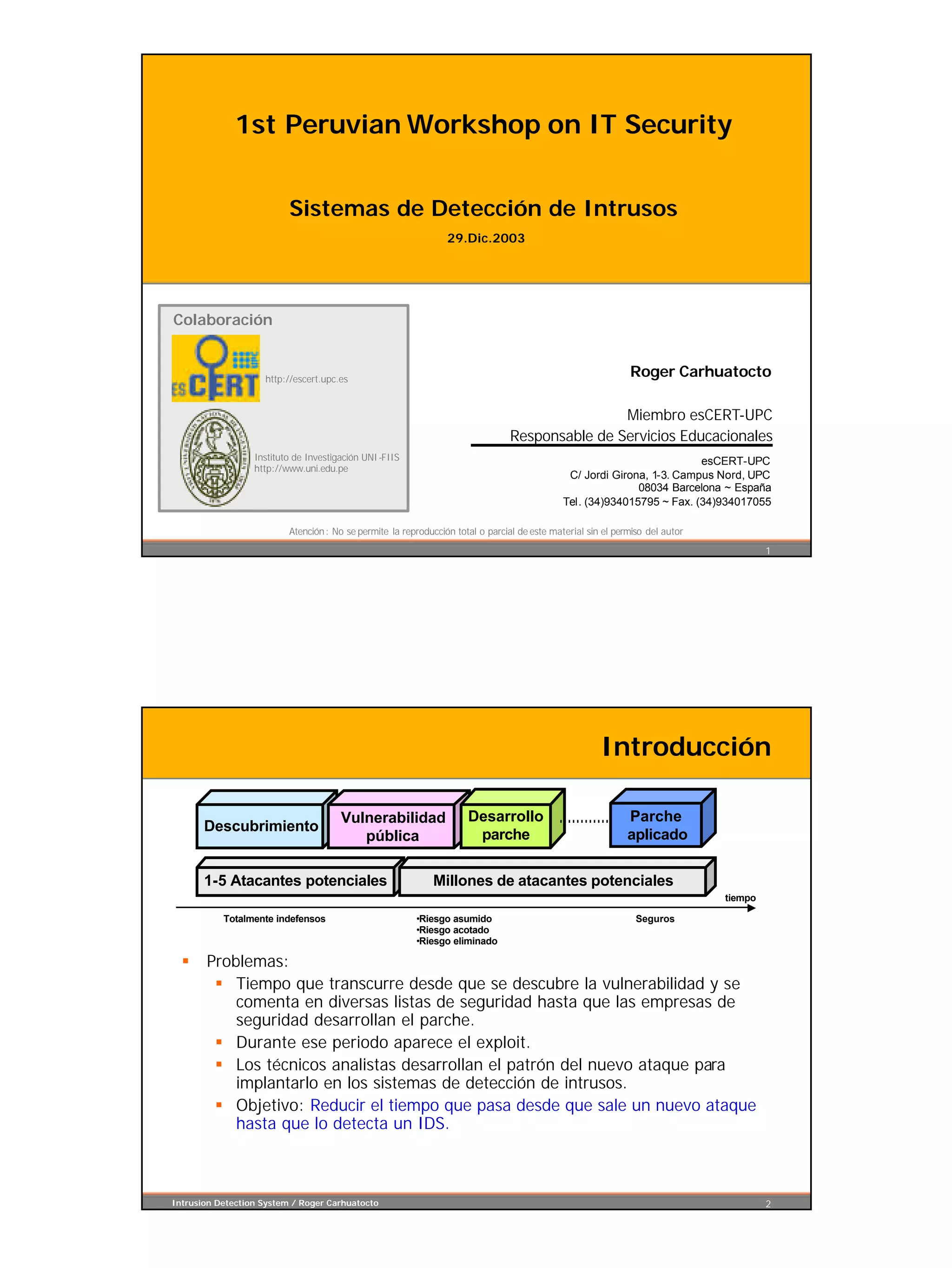 Este documento resume un taller sobre seguridad informática en Perú. Explica brevemente los sistemas de detección de intrusos, incluyendo su clasificación, funciones y dónde colocarlos en una red. También describe varios productos populares de detección de intrusos como Snort, Tripwire, Honeypot y RealSecure.
