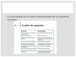 1) La tecnología es el resultado de la ciencia y el conocimiento humano, mientras que la ciencia busca comprender la naturaleza.