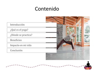El documento explora la práctica del yoga y su impacto positivo en el desarrollo personal y profesional de Daniela Grajales. Detalla los beneficios del yoga, que incluyen el aumento de la salud mental y física, la mejora en la toma de decisiones y la capacidad de manejar el estrés. La conclusión resalta que el yoga es una herramienta valiosa para el crecimiento integral y ofrece una invitación a practicarlo.
