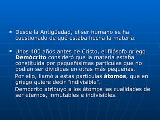 Este documento resume la historia de la teoría atómica desde la antigüedad hasta principios del siglo XX. Explica las leyes clásicas de la química y los modelos atómicos propuestos por científicos como Dalton, Thomson, Rutherford y Bohr. También describe la estructura del átomo y conceptos como número atómico, masa atómica e isótopos.