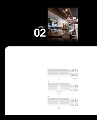 Este documento presenta una variedad de luminarias LED, incluyendo downlights empotrables para techo y pared, proyectores LED, y luminarias decorativas. Se describen las características técnicas como el tipo y temperatura de luz LED, materiales, y opciones de color. También incluye índices de lámparas y colores de referencia.