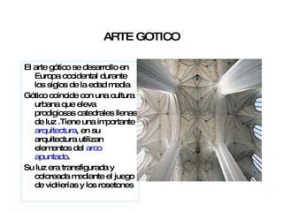 El documento describe varios estilos artísticos, incluyendo el arte gótico, arte clásico y arte renacentista. El arte gótico se desarrolló en Europa occidental durante la Edad Media y se caracterizó por la arquitectura de catedrales con arcos apuntados y vitrales. El arte clásico alcanzó su máxima perfección entre los siglos V y IV a.C. en Grecia, enfocándose en representar cuerpos humanos perfectos. El Renacimiento comenzó en Italia en el siglo XIV y se extend