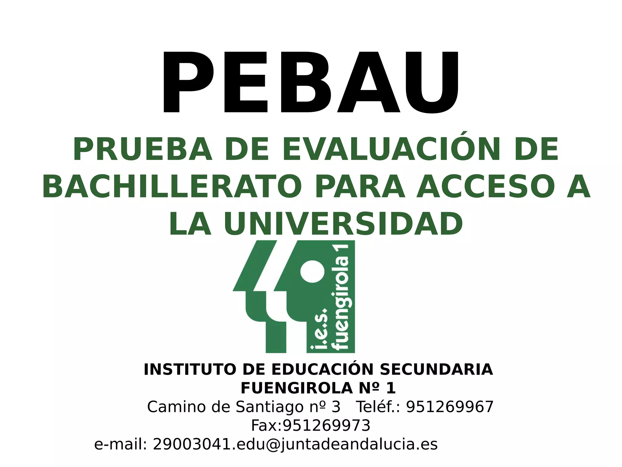 Este documento describe los cambios introducidos en la Prueba de Evaluación de Bachillerato para el Acceso a la Universidad (PEBAU) en Andalucía de acuerdo a la nueva Ley Orgánica de Mejora de la Calidad Educativa. La prueba consta ahora de dos fases: las Pruebas de Acceso (materias troncales de 2o de Bachillerato) y las Pruebas de Admisión (hasta 4 materias de opción). Se explican las materias, fechas y cálculo de las calificaciones de ambas fases, así como