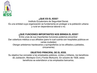 El documento habla sobre el Instituto Ecuatoriano de Seguridad Social (IESS). El IESS brinda cobertura médica y otorga préstamos a sus afiliados. Su objetivo principal es proveer beneficios de jubilación, montepío civil y fondo mortuorio a empleados públicos y privados. El documento explica los deberes de empleadores y empleados para afiliarse al IESS, así como los servicios y prestaciones que ofrece como cesantía, invalidez y vejez.