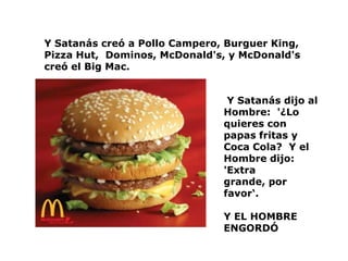 El documento contrasta las creaciones de Dios y Satanás relacionadas con la alimentación y el estilo de vida del hombre. Dios creó vegetales y frutas para una vida sana, mientras que Satanás creó comidas rápidas, chocolate y helado que causaron sobrepeso en el hombre y la mujer. Aunque Dios sugirió actividad física, Satanás fomentó el sedentarismo con inventos como la televisión, lo que llevó a problemas de salud que requirieron intervención médica.