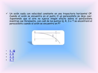 El documento presenta un problema sobre un avión que vuela a velocidad constante en una trayectoria horizontal OP. Un paracaidista se lanza desde el punto O. Se pregunta en qué punto (Q, R, S o T) estará el paracaidista cuando el avión llegue al punto P, suponiendo que el aire no afecta al paracaidista durante su caída libre.