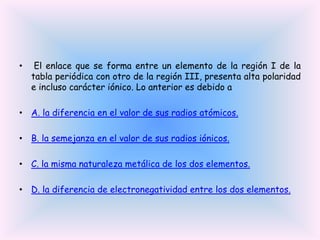 El documento trata sobre la formación de enlaces entre elementos de diferentes regiones de la tabla periódica. Explica que estos enlaces presentan alta polaridad e incluso carácter iónico debido a la diferencia de electronegatividad entre los dos elementos.