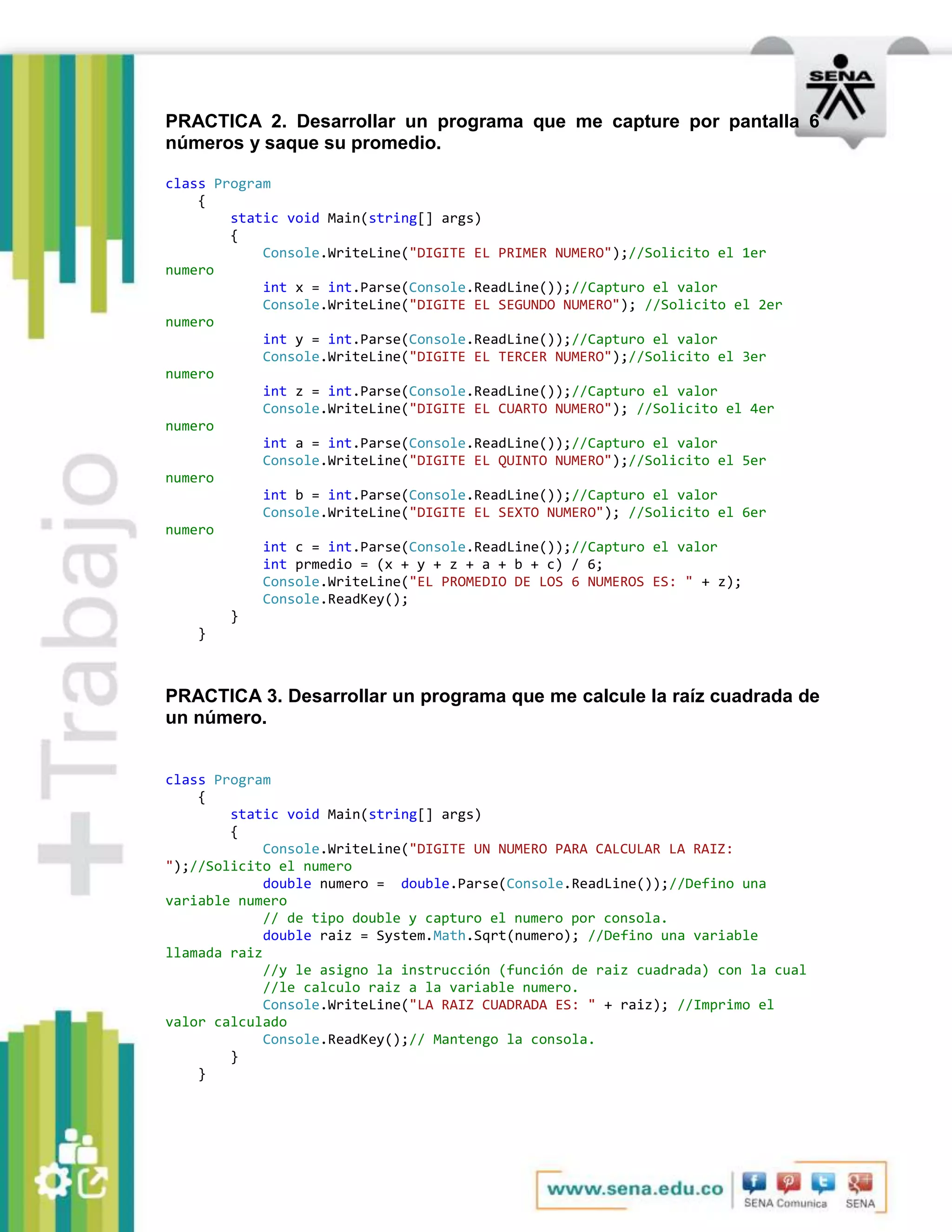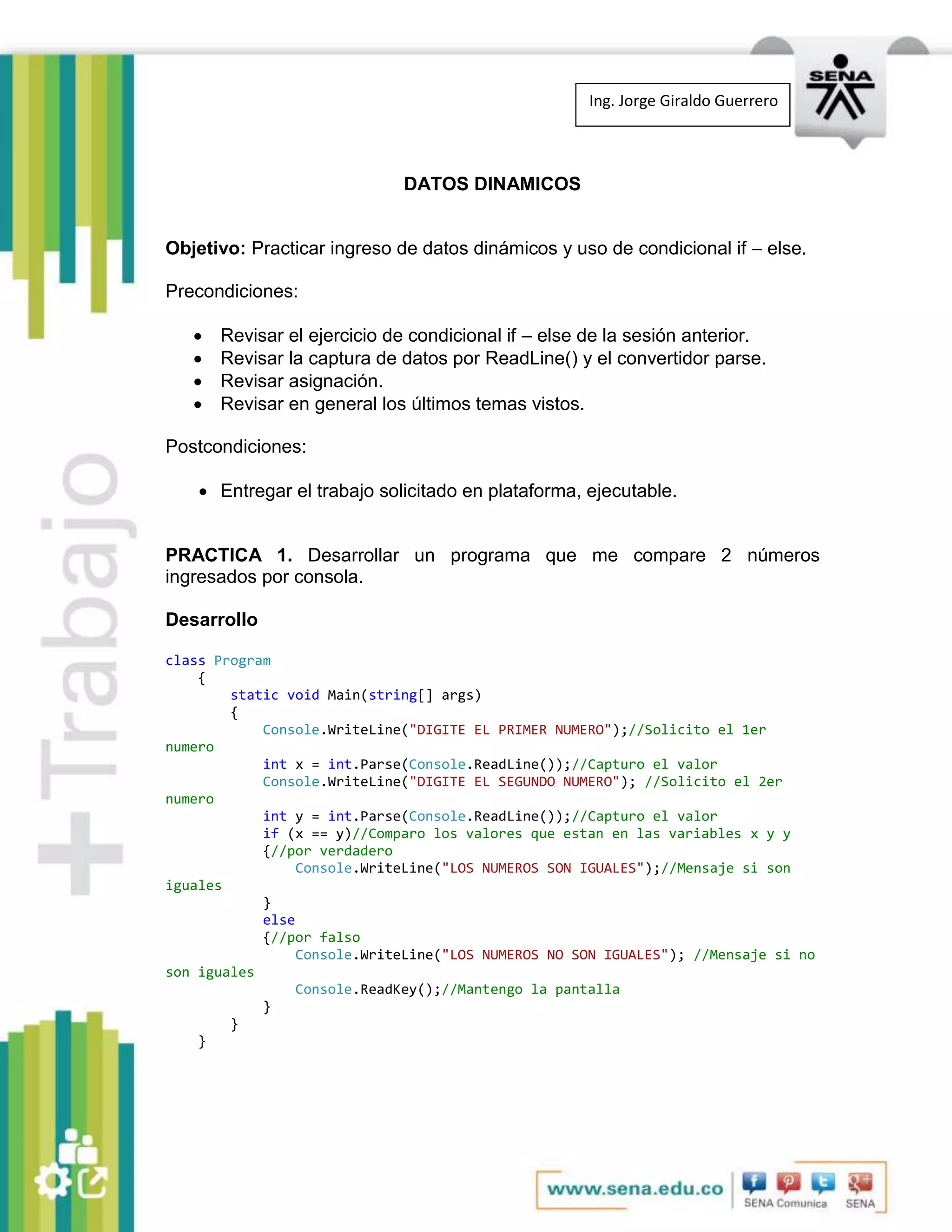 El documento describe ejercicios prácticos para practicar el ingreso de datos dinámicos y el uso de condicionales en programación. Se presentan tres prácticas que incluyen la comparación de dos números, el cálculo del promedio de seis números y el cálculo de la raíz cuadrada de un número, así como ejercicios prácticos relacionados con el salario de empleados y cálculos de área y perímetro de figuras geométricas. Se indican precondiciones y postcondiciones para la realización de las actividades.