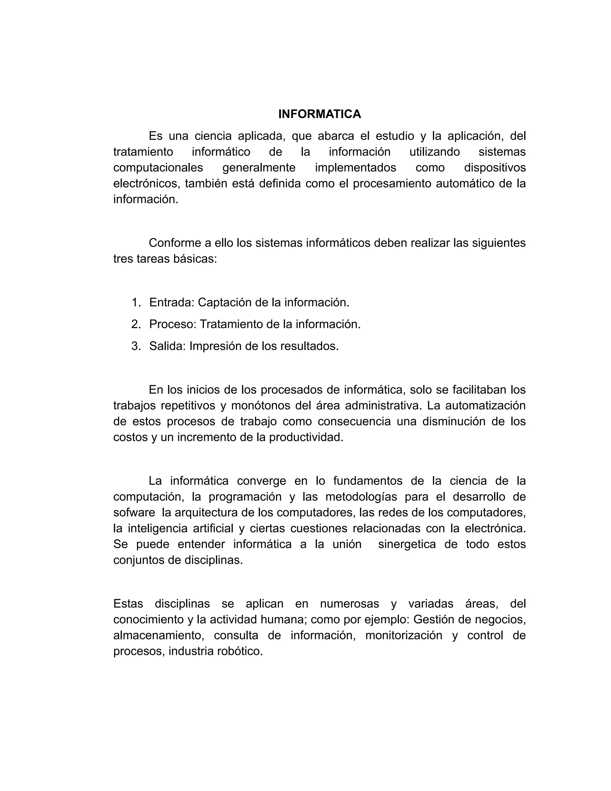 La informática es la ciencia que estudia el procesamiento automático de la información utilizando sistemas computacionales. Los sistemas informáticos realizan tres tareas básicas: captación de información, procesamiento y presentación de resultados. Inicialmente, la informática automatizaba tareas repetitivas de áreas administrativas para reducir costos y aumentar la productividad. Actualmente, la informática se aplica en diversas áreas como gestión empresarial, almacenamiento de datos, control de procesos industriales y robótica.