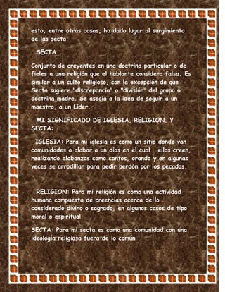 La iglesia se refiere a la congregación de los fieles cristianos unidos por el bautismo y cuyo cuerpo es Cristo. La religión implica un conjunto de creencias, normas morales y prácticas rituales como la oración y el sacrificio para adorar a uno o más dioses. Una secta es un grupo de creyentes en una doctrina particular que se considera diferente o en desacuerdo con la doctrina principal.