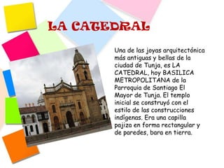 El documento describe varias iglesias y catedrales históricas en la ciudad de Tunja, Colombia. La Catedral es la joya arquitectónica más antigua de la ciudad, originalmente construida como una capilla de paredes de tierra. Otras iglesias notables incluyen la Iglesia de Santa Bárbara del siglo XVII, conocida por sus altares y arte colonial, e Iglesia de Santo Domingo del siglo XVI con pinturas murales y bajorrelieves de madera.