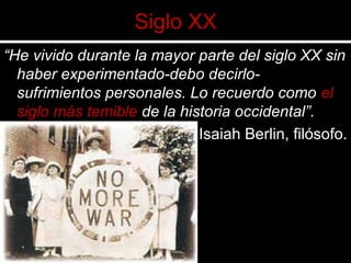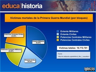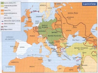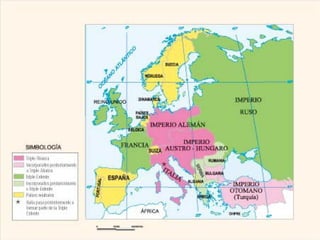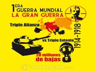 La Primera Guerra Mundial comenzó en 1914 debido a las rivalidades entre las grandes potencias europeas y sus alianzas. El conflicto resultó en más de 10 millones de muertes y cambió el mapa político de Europa. Los Tratados de Paz como el de Versalles impusieron duras condiciones a los países derrotados y crearon problemas que contribuyeron al ascenso del nazismo en Alemania.