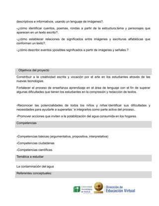 Este proyecto pedagógico busca mejorar la comprensión y redacción de textos en estudiantes de cuarto grado a través del uso de las TIC. El proyecto consiste en cuatro actividades principales: 1) presentar un video sobre contaminación del agua, 2) realizar un recorrido por hogares para identificar problemas, 3) reunirse con padres para establecer un plan de acción, 4) grabar un video mostrando los cambios logrados.