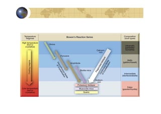 Este documento describe los procesos de formación de rocas ígneas. Explica que las rocas ígneas se forman por el enfriamiento y solidificación de magmas, los cuales se generan por fusión parcial debido a aumentos de temperatura y presión en el interior de la Tierra. También clasifica las rocas ígneas según su textura, mineralogía y contenido de sílice, e introduce conceptos como diferenciación magmática, asimilación y mezcla de magmas que generan diversidad litológica.