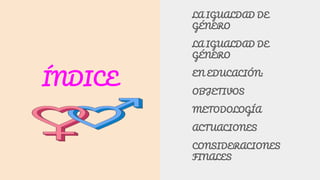 Este documento describe un plan para promover la igualdad de género en la educación a través de varias estrategias. El plan tiene como objetivo establecer una organización escolar y currículo sin sesgos de género, realizar acciones de sensibilización para la comunidad educativa, y prevenir la violencia de género. El plan propone una metodología participativa que involucre a todo el profesorado y alumnado, y describe varias actividades como análisis del entorno, búsqueda de materiales, y la inclusión de