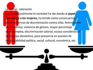 El documento discute la importancia de lograr la igualdad de género en la educación. Señala que la familia y los medios de comunicación a menudo refuerzan los estereotipos de género, pero que la escuela puede fomentar valores como la igualdad de oportunidades. Argumenta que la educación debe desarrollar a las personas como sujetos libres e independientes, y que una educación mixta ayuda a romper barreras entre los géneros.