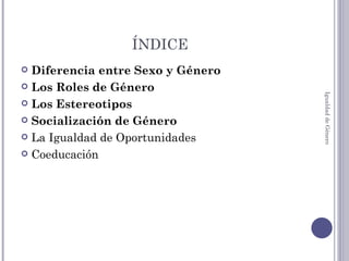 El documento aborda la igualdad de género, diferenciando entre sexo (biológico) y género (cultural), y analiza los roles y estereotipos de género impuestos por la sociedad. Se enfatiza la importancia de la coeducación y la igualdad de oportunidades para hombres y mujeres, promoviendo el acceso equitativo a bienes y derechos. También se menciona el artículo 14 de la constitución española, que establece la igualdad ante la ley y la prohibición de discriminación.