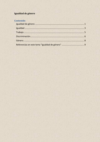 Este documento discute la desigualdad de género y la discriminación contra las mujeres. Explica que las mujeres enfrentan desventajas en el acceso a la educación, los recursos, el empleo y la salud. Además, experimentan tasas más altas de pobreza, analfabetismo y malnutrición. El documento también señala que a pesar de los avances legales, persisten los roles y estereotipos de género discriminatorios. Concluye que lograr la igualdad de género es fundamental para promover los derechos