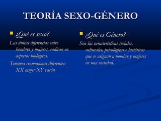 Este documento trata sobre la igualdad de género y los derechos entre hombres y mujeres. Explica las diferencias entre sexo y género, donde el sexo se refiere a características biológicas mientras que el género son características sociales y culturales. También describe cómo la socialización de género desde una edad temprana a través de cuentos, juegos, medios de comunicación refuerzan estereotipos de género que asignan roles tradicionales. El documento concluye instando