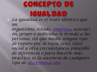 Este documento define los conceptos de igualdad, desigualdad, violencia de género y proporciona estadísticas sobre este tema. Explica que la igualdad significa un trato igual sin discriminación, mientras que la desigualdad implica un trato desigual. Define la violencia de género como actos de violencia contra la mujer y describe los tipos y procedimientos legales relacionados con las órdenes de protección. Finalmente, incluye estadísticas provisionales sobre víctimas y agresores de violencia de géner
