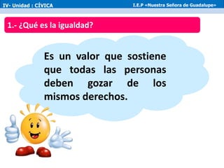 El documento define la igualdad como el valor que sostiene que todas las personas deben gozar de los mismos derechos y oportunidades para construir una sociedad democrática. También explica que la equidad implica dar a todas las personas las mismas posibilidades para desarrollarse como individuos y que el estado brinda facilidades a grupos desprotegidos para promover la equidad.