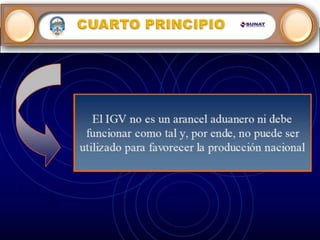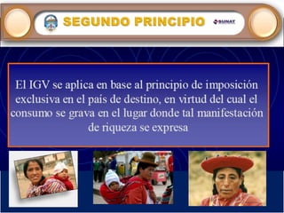 El Impuesto General a las Ventas (IGV) grava la venta de bienes muebles, la prestación de servicios, los contratos de construcción y la importación de bienes en Perú. El IGV se aplica a cada etapa de la producción y circulación de bienes y servicios al valor agregado, permitiendo deducir el impuesto pagado anteriormente. La tasa actual del IGV es del 18% y se liquida mensualmente.